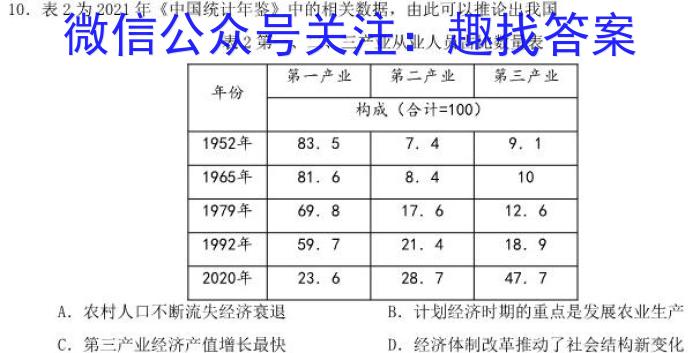 10.表2为2021年《中国统计年鉴》中的相关数据,由此可以推论出我国表2第一、二、三产业从业人员占比数量表A.农村人口不断流失经济衰退B.计划经济时期的重点是发展农业生产C.第三产业经济产值増长最快D.经济体制改革推动了社会结构新变化