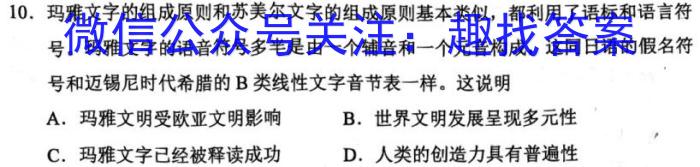 10.玛雅文字的组成原则和苏美尔文字的组成原则基本类似,都利用了语标和语言符号。玛雅文字的语音符号多半是由一个辅音和一个元音构成,这同日语的假名符号和迈锡尼时代希腊的B类线性文字音节表一样。这说明A.玛雅文明受欧亚文明影响B.世界文明发展呈现多元性C.玛雅文字已经被释读成功D.人类的创造力具有普遍性