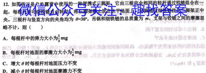 12.如图所示是户外露营中使用的一种便携式三脚架,它由三根完全相同的轻杆通过铰链组合在元起,每根杆均可绕铰链自由转动。将三脚架静止放在水平地面上,吊锅通过细铁链挂在三脚架正123。三根杆与竖直方向的夹角均为=30^,,吊锅和细铁链的总质量为m,支架与链之间的摩擦忽略不计,则()同不置女链小频.aA.每根杆中的弹力大小为13mgB.每根杆对地面的摩擦力大小为14mgC.增大θ时每根杆对地面压力不变yD.减小θ时每根杆对地面摩擦力不变