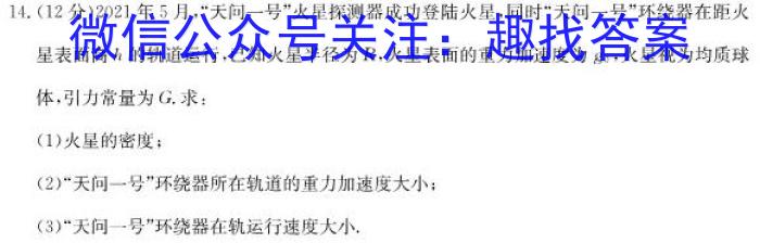 14.(12分)2021年5月,“天问一号”火星探测器成功登陆火星,同时“天问一号”环绕器在距火星表面高h的轨道运行,已知火星半径为R,火星表面的重力加速度为g0,火星视为均质球体,引力常量为G.求:(1)火星的密度;(2)“天问一号”环绕器所在轨道的重力加速度大小;(3)“天问一号”环绕器在轨运行速度大小.