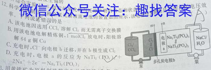 CCl4A.该电池因选用CCl溶解Cl而无需离子交换膜Cl2B.用该电池电解精炼铜,1molCl放电时,阳极溶解64g铜Cu1molCl2CuCl^-C.充电时,Cl向电极b迁移,并在b极生成ClCl2D.充电时,电极a的反应为NaTi(PO)NaTi2(PO4)32Na^++2e^-Na3Ti2(PO4)3综合12.科家D.综合实验1~3,微粒的氧化性与还原产物的价态和状态有关率。下列说法错误的是氯无膜液流电池的装置如图所示,该电池因