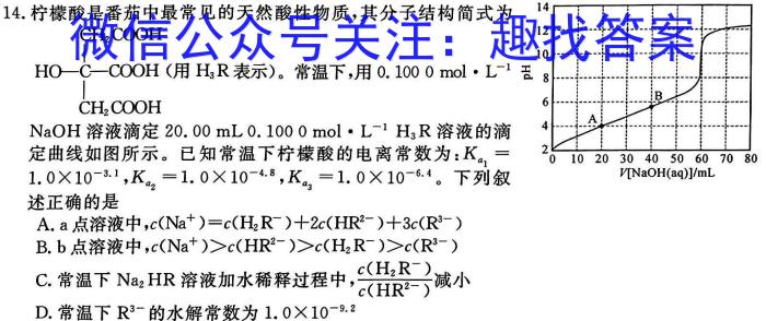 14.柠檬酸是番茄中最常见的天然酸性物质,其分子结构简式为NaOH溶液滴定20.00mL0.1000molL^-1H3R溶液的滴定曲线如图所示。已知常温下柠檬酸的电离常数为:Ka1=1.010^-3.1,Ka2=1.010^-4.8,Ka3=1.010^-6.4。下列叙述正确的是A.a点溶液中,c(Na^+)=c(H2R^-)+2c(HR^2-)+3c(R^3-)B.b点溶液中,c(Na^+)>c(HR^2-)>c(H2R^-)>c(R^3-)C.常温下Na2HR溶液加水稀释过程中,减小D.常温下R^3-的水解常数为1.010^-9.2