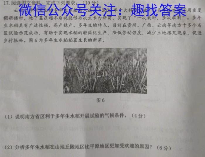 17.阅读图文资料,完成下列要求。(10分)云南大学研究出的多年生水稻被入选为“2024年十大科学突破”。多年生水稻不用重复翻耕播种,地下茎在越冬后就能够再次生长为新苗,实现了“一次栽种,多次收割”。多年生水稻具有广造性强、高产稳产、多年生的特点。目前在贵州、广西、云南等南方十多个省区试验示范成功,有助于实现水稻的轻简化生产,降低劳动强度,减少土地撂荒现象,促进乡村振兴。图6为多年生水稻稻茬生长的新芽。(1)说明南方省区利于多年生水稻开展试验的气候条件。(4分)(2)分析多年生水稻在山地丘陵地区比平原地区更加受欢迎的原因?(6分)