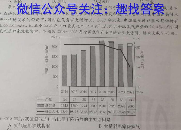 A.国防B.民航医疗D.商业氨气具有低密度、低溶解度、高导热率等特性,广泛应用于国防工业和高新技术领域,是不可或缺的战略性稀有气体资源。中国氨气资源利用晚,开发程度低。近年来,在中国高新技术产业快速发展的带动下,国内氨气需求大幅增长。2017年以来,中国氦气进(量长期保持在2.010^7m^3v)上,其中2018年进口量高达2.3110^7m^3,约占全球氦气产量的14.410,且中国氨气进口来源较集中。下图为2014∼2021年中国氨气产量与进口量走势图。据此完成56题。5.2018年后,我国氦气进口占比呈下降趋势的主要原因是
