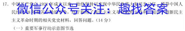 17.自1921年成立以来,始终坚持以实现中华民族伟大复兴为已任,领导中国人民经过28年艰苦卓绝的斗争,终于取得了新民主主义革命的伟大胜利。阅读下列新民主主义革命时期的相关党史材料,回答问题。(14分)(一)重要军事行动示意图节选
