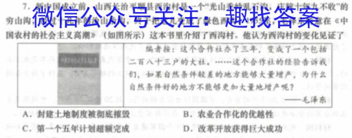7.新中国成立前,山西长治平顺县西沟村是一个“光山秃岭乱石沟,庄稼十年九不收”的穷山沟,经过十儿年的治山治沟,终于把这儿变成了绿色西沟。1955年,特意在《中国农村的社会主义高潮》(如图所示)这本书里介绍了西沟村。他认为西沟村的变化见证了A.封建土地制度被彻底摧毁B.农业合作化的优越性C.第一个五年计划超额完成D.改革开放获得巨大成功