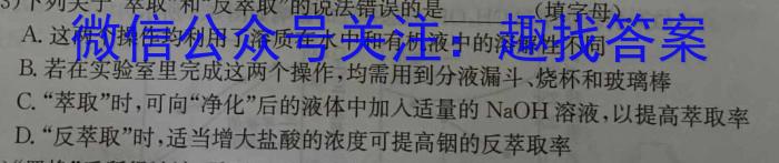 (3)下列关于“萃取”和“反萃取”的说法错误的是u(填字母)。A.这两个操作均利用了溶质在水中和有机液中的溶解性不同B.若在实验室里完成这两个操作,均需用到分液漏斗、烧杯和玻璃棒C.“萃取”时,可向“净化”后的液体中加人适量的NaOH溶液,以提高萃取率D.“反萃取”时,适当增大盐酸的浓度可提高钢的反萃取率