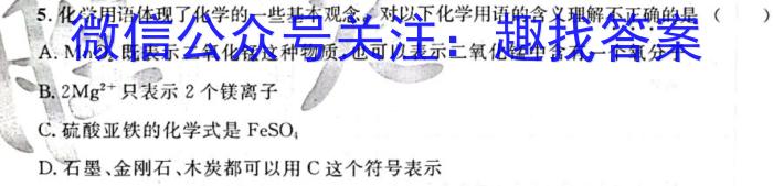 5.化学用语体现了化学的一些基本观念。对以下化学用语的含义理解不正确的是(A.MnO2既表示二氧化锰这种物质,也可以表示二氧化锰中含有一个氧分子B.2Mg^2+只表示2个镁离子C.硫酸亚铁的化学式是FeSO4D.石墨、金刚石、木炭都可以用C这个符号表示