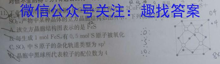 +2+3-2×2212×2-211.业上利用黄铜矿炼铜,反应的化学方程式是22CuFeS2+O2Cu2S+2FeS+eS-+SO2,,产产物中某种晶体的立方晶胞结构如图所示。下列说法错误的是(04+2A.该立方晶胞结构图表示的是B.每生成C.SO2S原子的杂化轨道类型为sp^3D晶胞中黑球所代表粒子的配位数为41molFeS,有0.5molS原子被氧化Os