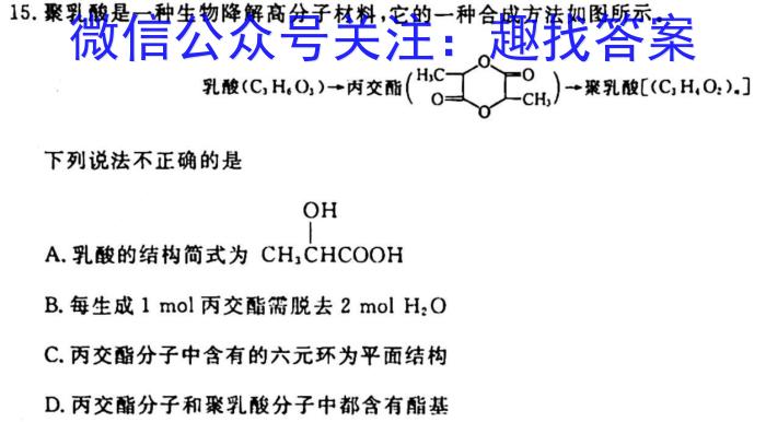 15.聚乳酸是一种生物降解高分子材料,它的一种合成方法如图所示乳酸(C3H6O3))→丙交酯聚乳酸[(C3H4O2),]下列说法不正确的是OHA.乳酸的结构简式为CH3CHCOOHB.每生成1mol丙交酯需脱去2molH2OC.丙交酯分子中含有的六元环为平面结构D.丙交酯分子和聚乳酸分子中都含有酯基