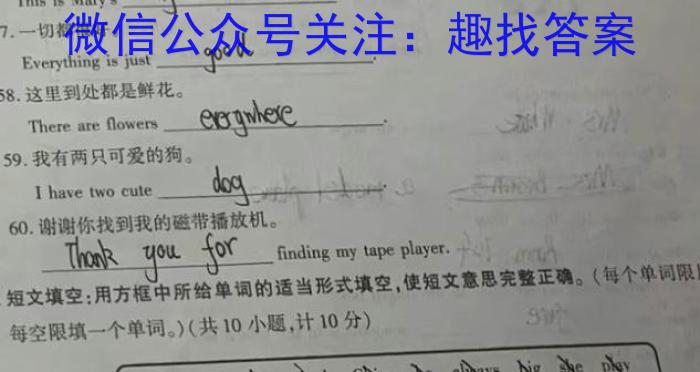 V.完成句子:根据所给汉语意思,用单词或短语完成下列英文句子。(共5小题,计10分)56.这是玛丽的英语笔记本This is M y’s____ Englishmebak____57.一切都很好。Everything is just ____good____58.这里到处都是鲜花。There are flowers ____evergonese____59.我有两只可爱的狗。I have two cute ____dag____60.谢谢你找到我的磁带播放放机,____Thank you8for____finding my tape player.空,
