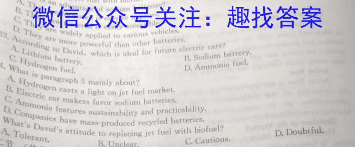 performance is easy to improve.Thir raw material is easily a cees sible.333.AC. They are widely applied to various vehicles.. They are more powerful than other batteries.33. According to David, which is ideal for future electric cars?C. Hydrogen fuel.avA. Lithium battery.y.B.SodiA34.What is paragraph 5 mainly about?B.A. Hydrogen casts a light on jet fuel market.D. Ammonia fuel.B. Electric car makers favor sodium batteries.C. Ammonia features sustainability and practicability.D. Companies have mass-produced recycled batteries.D. Doubtful.
