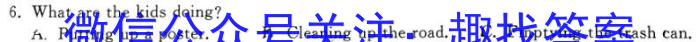 6.What are the kids doing?A. Putting up a poster.B Cleaning up the road.C.Fmp tying the trash can.