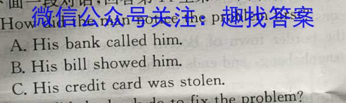 听下面一段对话,回答第14至第17四个小题。14. How did the man notice the problem first?A. His bank called him.B. His bill showed him.C.His credit card was stolen.