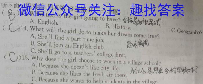 听下面一段对话,回答第13至第1至第15三个小题。B) 13. What test is the girl going to have?A.English.)1B.HisHistory.14. What will the girl do to make her dream come true?C.Geography.A.She’ll find ad a part-time job.B.3.She’ll join an English club.怎么实现C.She’ll go to a teachers’ college first.015. Why does the girl choose to work in aA.Because she doesn’t likevillage school?t like city life.B. Because she likes the fresh air there.为什么选择在乡村学校作?CC. Because she wants to help students in the village.