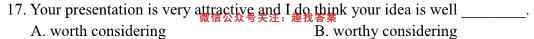 17.Your presentation is very attractive and I do think your idea is well .____A.worth considering B.worthy considering