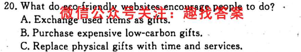 20.What do eco-friendly websites encourage people to do?A.Exchange used items as gifts.B.Purchase expensive low-carbon gifts.C.Replace physical gifts with time and services.
