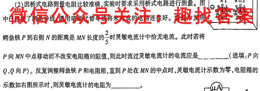 (2)因桥式电路测量电阻比较准确,实验时要求采用桥式电路进行测量。图中已连接了两条导线,请用笔画代替导线将未完成的电路连接好。实验中发现鳄鱼铗P到右侧N的距离是MN长度的时灵敏电流计中恰无电流。此时若将P向MN中点移动而不改变电阻箱的阻值,则此时流过灵敏电流计的电流应是(选填:P向Q、Q向P)。反复调整鳄鱼P和电阻箱,直到P处在MN的中点时,灵敏电流计示数为零,电阻箱的示数如右图所示时,则灵敏电流计的电阻为。
