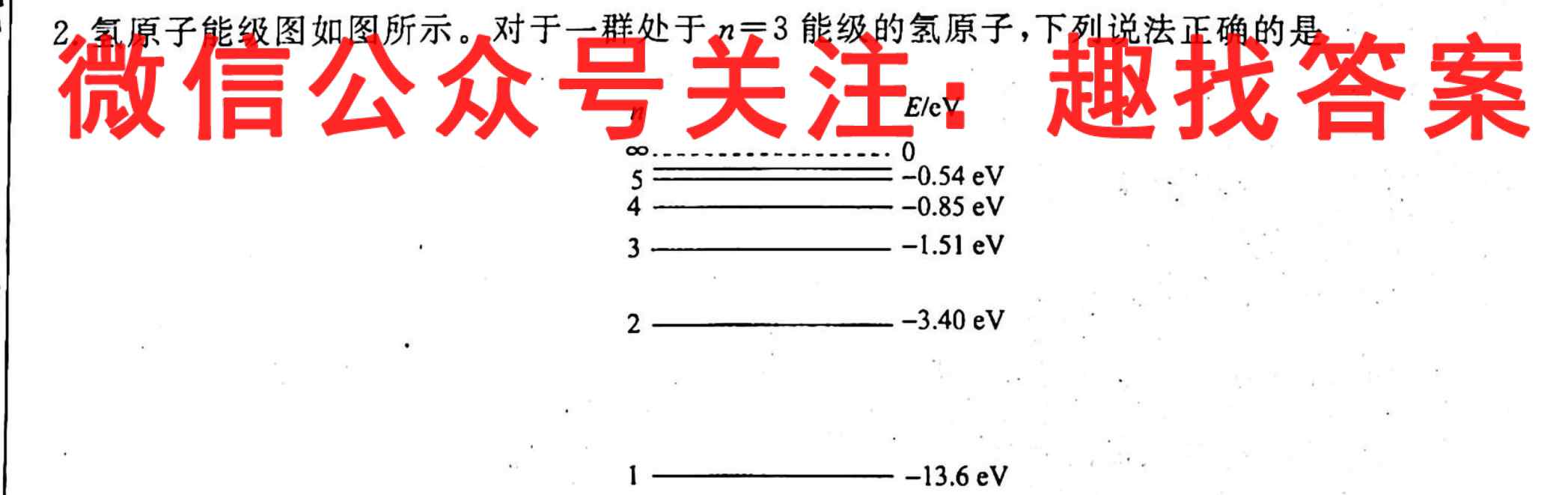 2.氢原子能级图如图所示。对于一群处于n=3能级的氢原子,下列说法正确的是nE/eV05-0.54eV4一-0.85eV—-1.51eV2-3.40ev1—-13.6eV