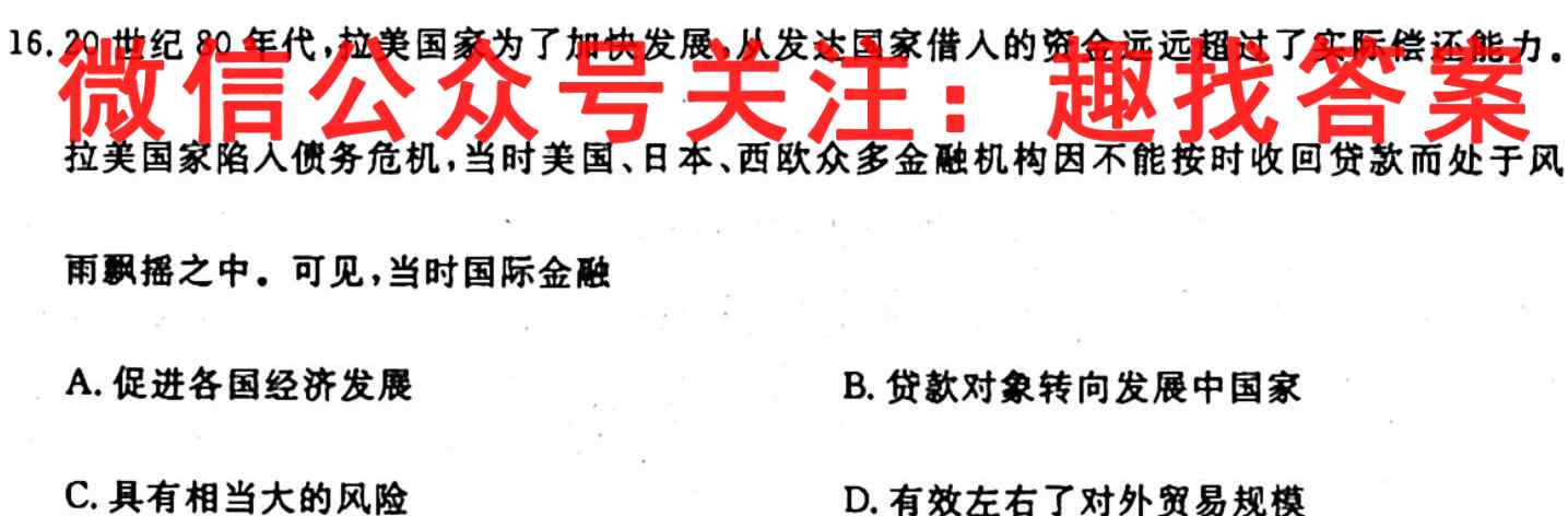 16.20世纪80年代,拉美国家为了加快发展,从发达国家借入的资金远远超过了实际偿还能力,拉美国家陷入债务危机,当时美国、日本、西欧众多金融机构因不能按时收回贷款而处于风雨飘摇之中,可见,当时国际金融A.促进各国经济发展B.贷款对象转向发展中国家C.具有相当大的风险D.有效左右了对外贸易规模