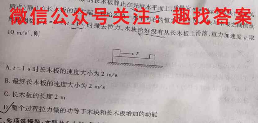 8.如图所示,质量为M=2kg的长木板静止在光滑水平面上,质量为m=1kg的木块(可视为摩擦因数为质点)静止在长木板的最左端。现给木块一水平向右的恒力F=6N,木块与木板之间的动=0.2,t=1,sF=6N,10m/s^2,则s时撤去拉力,木块恰好没有从长木板上滑落,重力加速度g取BFA.t=1时长木板的速度大小为2m/sB.最终长木板的速度大小为2m/sC.长木板的长度2D/整个过程拉力做的功等于木块和长木板增加的动能