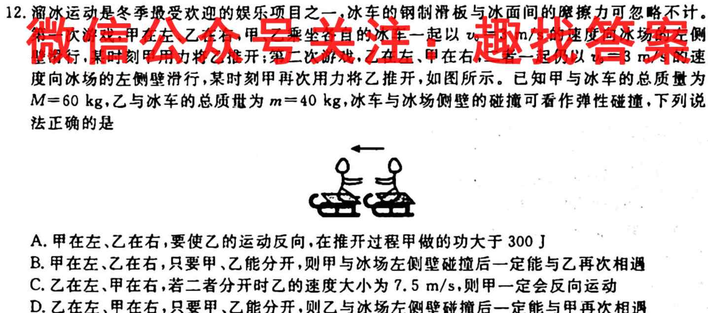 12.溜冰运动是冬季最受欢迎的娱乐项目之一,冰车的钢制滑板与冰面间的摩擦力可忽略不计。第一次游戏,甲在左、乙在右,甲、乙乘坐各自的冰车一起以v0=3m/s的速度向冰场的左侧壁滑行,某时刻甲用力将乙推开;第二次游戏,乙在左、甲在右,二者一起仍以v0=3m/s的速度向冰场的左侧壁滑行,某时刻甲再次用力将乙推开,如图所示。已知甲与冰车的总质量为M=60kg,乙与冰车的总质世为m=40kg,冰车与冰场侧壁的碰撞可看作弹性碰撞,下列说法正确的是A.甲在左、乙在右,要使乙的运动反向,在推开过程甲做的功大于300JB.甲在左、乙在右,只要甲、乙能分开,则甲与冰场左侧壁碰撞后一定能与乙再次相遇C.乙在左、甲在右,若二者分开时乙的速度大小为7.5m/s,则甲一定会反向运动D.乙在左、甲在右,只要甲、乙能分开,则乙与冰场左侧壁碰撞后一定能与甲再次相遇