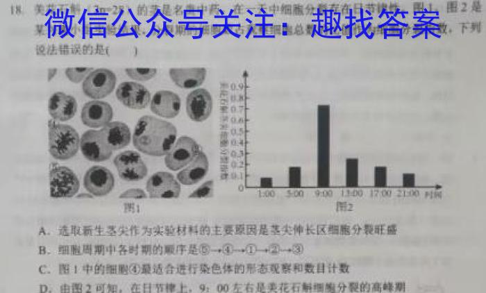 18.美花石斛(2=28)的茎是名责中药,在一天中细胞分裂存在日节律性,图1,、图2是某兴趣小组实验结果,分裂期的细胞数占观察细胞总数的比值作为细胞分裂指数,下列说法错误的是()1005009:0012001700图:图2A.选取新生茎尖作为实验材料的主要原因是茎尖伸长区细胞分裂旺盛B.细胞周期中各时期的顺序是C.图1中的细胞④最适合进行染色体的形态观察和数目计数D.由图2可知,在日节律上,9:00左右是美花石解细胞分裂的高峰期