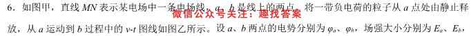 6.如图甲,直线MN表示某电场中一条电场线,a、b是线上的两点。将一带负电荷的粒子从a点处由静止释放,从a运动到b过程中的V=t图线如图乙所示。设a、b两点的电势分别为a、b,,场强大小分别为Ea、Eb,