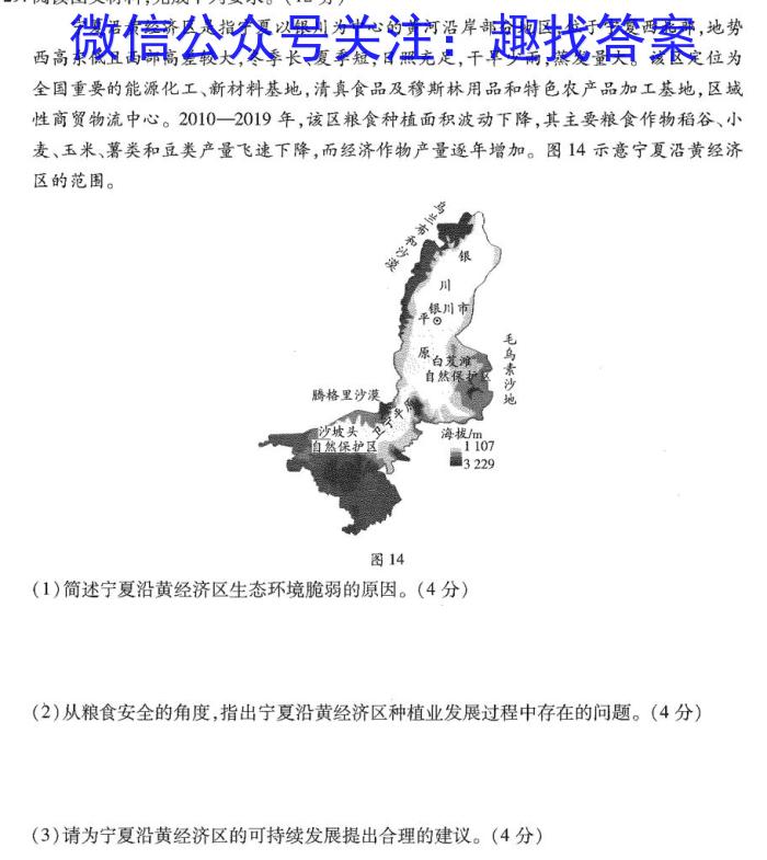 宁夏沿黄经济区是指宁夏以银川为中心的黄河沿岸部分地区,位于宁夏西北部,地势西高东低且西部高差较大,冬季长、夏季短,日照充足,干旱少雨,蒸发量大。该区定位为全国重要的能源化工、新材料基地,清真食品及穆斯林用品和特色农产品加工基地,区域性商贸物流中心。2010-2019年,该区粮食种植面积波动下降,其主要粮食作物稻谷、小麦、玉米、薯类和豆类产量飞速下降,而经济作物产量逐年增加。图14示意宁夏沿黄经济区的范围。图14(1)简述宁夏沿黄经济区生态环境脆弱的原因。(4分)(2)从粮食安全的角度,指出宁夏沿黄经济区种植业发展过程中存在的问题。(4分)(3)请为宁夏沿黄经济区的可持续发展提出合理的建议。(4分)