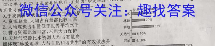 2024年4月22日是世界地球日,主题为“珍爱地球,人与自然和谐共生”。下图示意中国人均资源占有量与世界平均水平的比例。据此完成11∼12B11.关于我国资源状况,下列描述正确的是,世界平均100%水25%林地120%B.人均煤炭占有量低于世界平均水平C.耕地资源比较丰富,不用大力保护D.天然气资源比水资源人均占有量高耕地■33%天然气6.50%