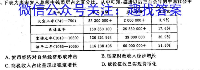 3.下表为唐宋岁人总额中钱币所占之百分比。从中可知,盛唐以后三百余年的中国社会中A.货币经济对自然经济形成冲击B.国家财政收人稳步增长C.商税收入占比呈现出稳定增长D.赋役征收已实现货币化