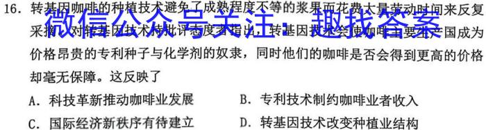 16.转基因咖啡的种植技术避免了成熟程度不等的浆果而花费大量劳动时间来反复采摘。对转基因技术持批评态度者指出,转基因技术会使咖啡主要生产国成为价格昂贵的专利种子与化学剂的奴隶,同时他们的咖啡是否会得到更高的价格却毫无保障。这反映了A.科技革新推动咖啡业发展B.专利技术制约咖啡业者收入C.国际经济新秩序有待建立D.转基因技术改变种植业结构