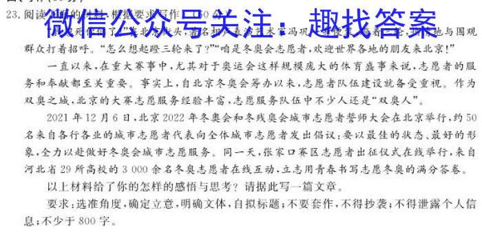23.阅读下面的材料,根据要求写作。(60分)“我想死你们了!”在北京街头,著名相声表演艺术家冯巩一身便装,蹬着三轮,热情地与围观群众打着招呼。“怎么想起蹬三轮来了?”“咱是冬奥会志愿者,欢迎世界各地的朋友来北京!”一直以来,在重大赛事中,尤其对于奥运会这样规模庞大的体育盛事来说,志愿者的服务和奉献都至关重要。事实上,自北京冬奥会筹办以来,志愿者队伍建设就备受重视。作为双奥之城,北京的大赛志愿服务经验丰富,志愿服务队伍中不少人还是“双奥人”。2021年12月6日,北京2024年冬奥会和冬残奥会城市志愿者誓师大会在北京举行,约50名来自各行各业的城市志愿者代表向全体城市志愿者发出倡议:要以最佳的状态、最好的形象,全力以赴做好冬奥会城市志愿服务。同一天,张家口赛区志愿者出征仪式在线举行,来自河北省29所高校的3000余名冬奥志愿者在线互动,立志用青春书写志愿冬臭的满分答卷。以上材料给了你的怎样的感悟与思考?请据此写一篇文章。要求:选准角度,确定立意,明确文体,自拟标题;不要套作,不得抄袭;不得泄露个人信息;不少于800字。