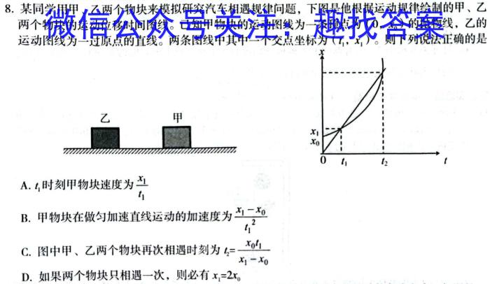 8.某同学用甲、乙两个物块来模拟研究汽车相遇规律问题,下图是他根据运动规律绘制的甲、乙两个物块的运动位移时间图线。已知甲物块的运动图线为一条顶点为(0,×0)的抛物线,乙的运动图线为一过原点的直线。两条图线中其中一个交点坐标为(t1,x1)。则下列说法正确的是A.t1时刻甲物块速度为B.甲物块在做匀加速直线运动的加速度为x1-x0t1^2C.图中甲、乙两个物块再次相遇时刻为l2=x0t1x1-x0D.如果两个物块只相遇一次,则必有x1=2×0