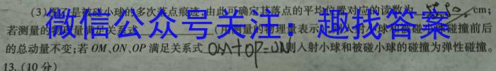 (3)图乙是被碰小球的多次落点痕迹,由此可确定其落点的平均位置对应的读数为5580。若测量的物理量满足关系式(用测量的物理量表示),则入射小球和被碰小球碰撞前后的总动量不变;若0M、ON、OP满足关系式0M+OP-O则入射小球和被碰小球的碰撞为弹性碰撞。13.(10分)