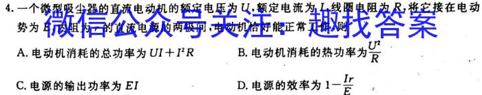 4.一个微型吸尘器的直流电动机的额定电压为U,额定电流为I,线圈电阻为R,将它接在电动势为E,内阻为r的直流电源的两极间,电动机恰好能正常工作,则A.电动机消耗的总功率为UI+I^2RB.电动机消耗的热功率为U^2RC.电源的输出功率为EI电源的效率为1-IrE