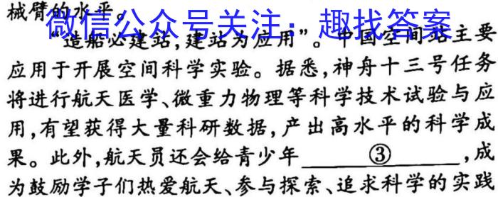 (二)语言文字运用Ⅱ(本题共2小题,11分)阅读下面的文字,完成4~5题。随着“天和”核心舱发射,①。按照组建计划,2021年至2024年,我国会通过11次航天发射完成空间站建设,包括之后的4次货运飞船、4次载人飞船发射,以及“问天”和“梦天”两个实验舱发射。与国际空间站相比,②,但是起点高,站内配备的设备比较先进。载荷支持效率高,可提供多种标准接口,有望取得可观的工程应用效益。尤其是配备的大小两根机械臂,均有7个自由度,可独立和组合使用,具有负载25吨的抓取能力和厘米级的高精度操作能力,可完成舱外载荷的安装、更换等复杂操作,完全达到世界第三代空间机械臂的水平。“造船必建站,建站为应用”。中国空间站主要应用于开展空间科学实验。据悉,神舟十三号任务将进行航天医学、微重力物理等科学技术试验与应用,有望获得大量科研数据,产出高水平的科学成果。此外,航天员还会给青少年③,成为鼓励学子们热爱航天、参与探索、追求科学的实践平台。中国空间站的建成还将为开展包括航天员联合飞行在内的更广泛国际合作提供精彩舞台。