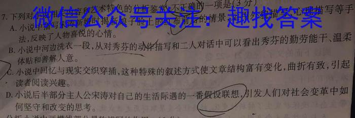 7.下列对小说相关内容和艺术特色的分析鉴赏、不正确的一项是(3分)A.小说中描写宋涛新婚时揭新娘子脸上的红布前后的情景,运用外貌描写、心理描写等手法,反映了人物喜悦的心情。B.小说中河边洗衣一段,从对秀芬的动作描写和二人对话中可以看出秀芬的勤劳能干、温柔体贴和善解人意。C.小说中回忆与现实交织穿插,这种特殊的叙述方式使文章结构富有变化,曲折有致,引起读者阅读兴趣。D.小说后半部分主人公宋涛对自己的生活际遇的一番假设联想,发人们对社会变革中如何坚守和改变的思考。