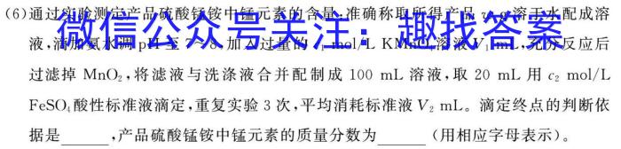 (6)通过实验测定产品硫酸锰铵中锰元素的含量:准确称取所得产品wg溶于水配成溶液,滴加氨水调pH至7∼8,,加入过量的c1mol/LKMnO4溶液V1mL,充分反应后过滤掉MnO2,,将滤液与洗涤液合并配制成100mL溶液,取20mL用c2mol/LFeSO4酸性标准液滴定,重复实验3次,平均消耗标准液V2mL。滴定终点的判断依据是,产品硫酸锰铵中锰元素的质量分数为(用相应字母表示)。