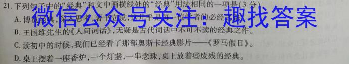 21.下列句子中的“经典”和文中画横线处的“经典”用法相同的一项是(3分)A.博览经典,深人思考,著书立说,这几乎是每一位学者的必经之路。B.王国维先生的《人间词话》,无疑是古代词话中不可不读的经典之作。C.读初中的时候,我们已经看了那部奥斯卡经典影片——《罗马假日》。D.桌上摆着一座香炉,一个灯盏,一串念珠,桌上放着些废残的经典。
