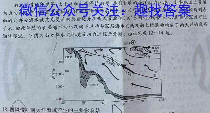 南大洋贯通印度洋、太平洋和大西洋的南部,具有独特的海洋动力环境。南半球西风带驱动出向赤道方向的艾克曼输送,使得其南侧海水辐散,从而形成强烈的上升流,上升流输送到表面的大部分海水被艾克曼流向北输送并在西风带北侧(40^S附近)辐合下沉,其最大深度可达千米,由此伴随的表层海水向北及向下运动和深层海水向南及向上的运动构成了南大洋的浅层翻转环流。下图为南大洋水文环境及动力过程示意图。据此完成12~14题。12.西风带对南大洋海域产生的主要影响是