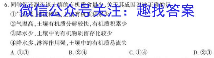 6.同学们还测得该土壤的有机质含量少,关于其成因说法正确的是①气温低,植被稀疏,土壤有机质积累少②气温高,土壤有机质分解较快,有机质积累少③降水少,土壤中的有机物质留存比较少④降水多,淋溶作用强,土壤中的有机质易流失A.①③B.②④C.①④D.②③