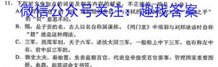 11.下列对文中加点的词语及相关内容的解说,不正确的一项是(3分)A.“吾未识也”的“识”是知道的意思,与苏轼的(石钟山记》中“汝识之乎”的“识”意思不同。B.赐,是子贡的名,古人以名自称属谦称,(鸿门》中项羽与刘邦话时自称“结”就是这种用法。C.三军,西周军制,天子六军,诸侯大国三军,一般称上中下三军,也有称左中右、前中后三军的。D.御史大夫,秦始置,负责察百官,代表皇帝接受百官奏事,管理国家重要图册、典籍,起草诏命文书等,