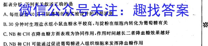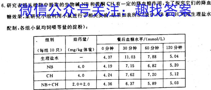 6.研究表明从植物中提取的生物碱NB和黄酮CH有一定的降血糖作用,为了探究它们的降血糖效果,某研究小组利用小鼠进行了相关实验,结果如表所示(表中NB和CH1均用生理盐水配制,各组小鼠均饲喂等量的淀粉):据表分析,下列有关叙述正确的是A.每组设置10只小鼠遵循的是实验设计的对照原则B.30分钟时生理盐水组小鼠血糖水平较高,与淀粉在细胞内转化为葡萄糖有关C.NB和CH在降血糖方面表现为协同作用,作用时间越长二者降血糖效果越好D.NB和CH可能通过促进葡萄糖进入组织细胞来发挥降血糖作用
