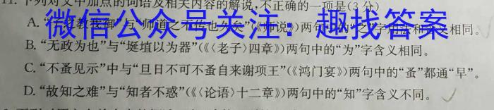 11.下列对文中加点的词语及相关内容的解说,不正确的一项是(3分A.“子之教我御”与“师道之不传也久矣”(《师说》)两句中的“之”字用法和含义相同。B.“无政为也”与“蜒填以为器”(《老子》四章》)两句中的“为”字含义相同。C.“不蚤见示”中与“旦日不可不蚤自来谢项王”(《鸿门宴》)两句中的“蚤”都通“早”。D.“故知之难”与“知者不惑”(《论语》十二章》)两句中的“知”字含义不同。