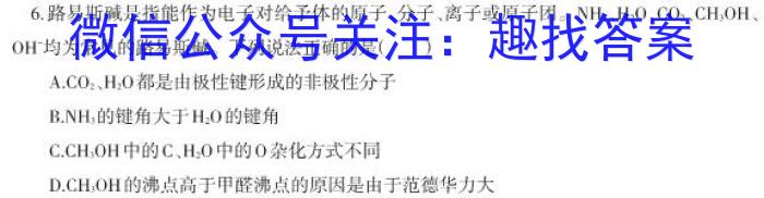 6.路易斯碱是指能作为电子对给予体的原子、分子、离子或原子团。NH3、H2O、CO2、CH3OH、OH均为常见的路易斯碱。下列说法正确的是(A.CO2、H2O都是由极性键形成的非极性分子B.NH3,的键角大于H2O的键角C.CH3OH1中的C、H2O中的杂化方式不同D.CH3OHI的沸点高于甲醛沸点的原因是由于范德华力大