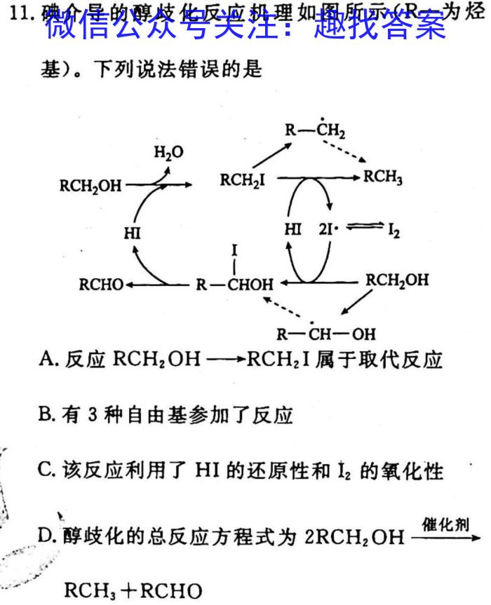 11.碘介导的醇歧化反应机理如图所示(R一为烃基)。下列说法错误的是x”A.反应RCH2OH[]RCH2I属于取代反应B.有3种自由基参加了反应C.该反应利用了HI的还原性和I2的氧化性D.醇歧化的总反应方程式为2RCH2OH催化剂RCH3+RCHO