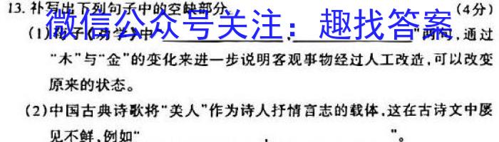 13.补写出下列句子中的空缺部分。(4分)(1)苟子《劝学》中“.“两句,通过“木”与“金”的变化来进一步说明客观事物经过人工改造,可以改变原来的状态。(2)中国古典诗歌将“美人”作为诗人抒情言志的载体,这在古诗文中屡见不鲜,例如“.“。