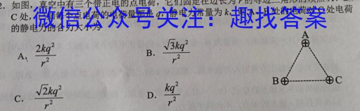 2.如图,真空中有三个带正电的点电荷,它们固定在边长为r的等边三角形的顶点A、B、C处,已知每个点电荷的电荷量都是q,,静电力常量为k,则A、B处的电荷对C处电荷的静电力的合力大小为AA.2kg^2r^23.3kg^2r^2C.2kg^2r^2D.kq^2r^2C