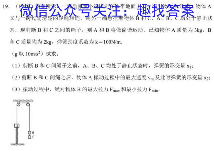 19.(14分)如图所示,一轻质弹簧小端固定在水平地面上,上端与物体A连接,物体A又与一跨过定滑轮的轻绳相连,绳另一端悬挂着物体B和C,A、B、C均处于静止状态,现剪断B和C之间的绳子,则A和B将做简谐运动,已知物体A质量为3kg,B和C质量均为2kg,弹簧劲度系数为k=100N/m.(g取10m/s^2)试求:(1)剪断B和C间绳子之前,A、B、C均处于静止状态时,弹簧的形变量x1;(2)剪断B和C间绳之后,物体A振动过程中的最大速度Vm及此时弹簧的形变量x2;(3)振动过程中,绳对物体B的最大拉力Fmax和最小拉力F.